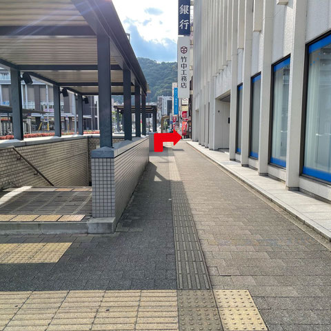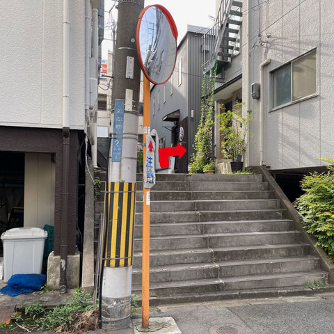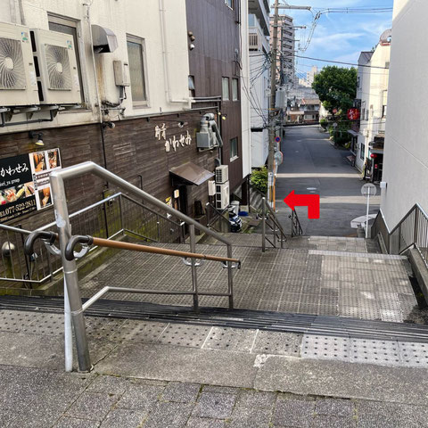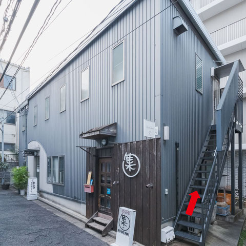 階段を降りると、左手にもうひとつ上り階段が現れます。その先に見える、1階に「集(つどい)」という店舗が入ったグレーの建物が目印です。